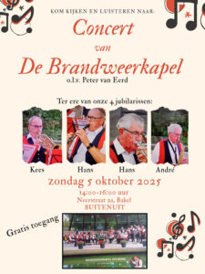 zondag 5 oktober concert van de Brandweerkapel bij Buitenuit. Tijd: 14:00-16:00 Gratis toegang